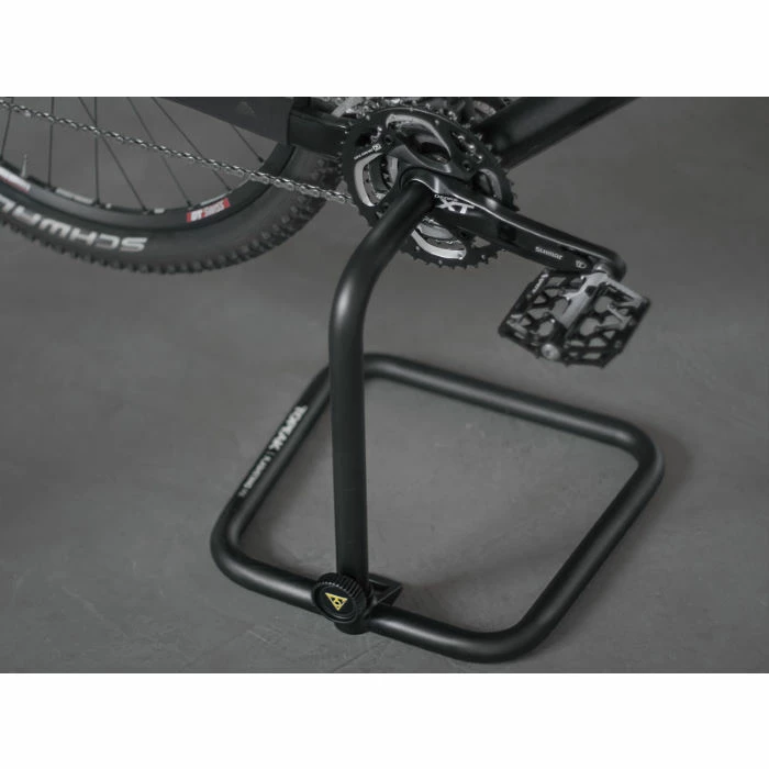Specifically designed for use with hollow spindle cranksets, the Flashstand MX has a wide square-shaped base that offers solid and steady support to your bike. Held in place by a detachable arm that fits right inside your drive side spindle to keep your bike elevated, the whole unit takes the weight of the rear end of your bike, while your front wheel stands steady on the ground.