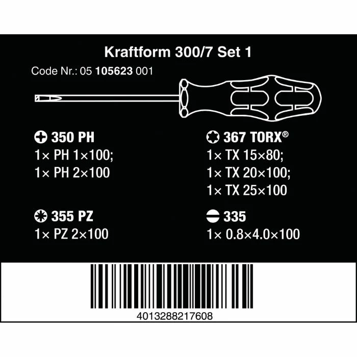 7-piece screwdriver set with Kraftform Plus handle for comfortable ergonomic screwdriving, which avoids blisters and calluses. Hard handle zones for high working speeds, while soft handle zones guarantee a high torque transfer. Includes some tools with Lasertip blades: The tip clings to the screw head and prevents it from slipping out. Take it easy tool finder with colour coding and size stamping – for easy and fast location of the required tool. The anti-roll protection avoids bits from annoying rolling away in the workplace.